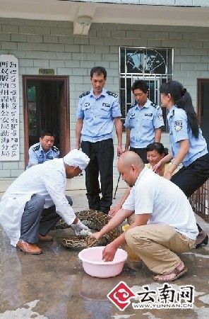 幫巨蟒清洗完身體后,民警當場為其體檢:身長3.7米,腹圍粗為55厘米,重達25公斤。經西雙版納傣族自治州林業局野生動物保護站獸醫師許定澤鑒定,這條巨蟒屬于國家一級保護野生動物的雌性金花蟒,年齡約20歲左右。根據蟒蛇約35歲左右的壽命推算,其應該正處于盛年期。據許定澤介紹,這樣大的金花蟒,實屬罕見。(戴振華 常宗波)