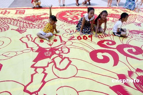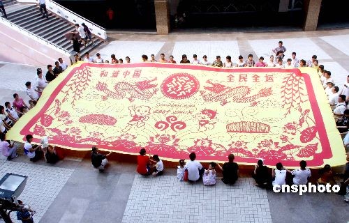 2009年7月5日,濟(jì)南剪紙藝術(shù)院的工作人員和市民在濟(jì)南市泉城廣場(chǎng)展示巨幅剪紙作品。當(dāng)天是第十一屆全運(yùn)會(huì)倒計(jì)時(shí)100天,濟(jì)南剪紙藝術(shù)院的120多名藝人耗時(shí)6個(gè)月,共同創(chuàng)作完成巨幅剪紙作品。據(jù)了解,該作品總面積61.6平方米,長(zhǎng)11米(寓意第十一屆全運(yùn)會(huì)),寬5.6米(寓意56個(gè)民族),主題為和諧中國(guó)、全民全運(yùn)。作品中的圖案包含十一全運(yùn)會(huì)標(biāo)志、吉祥物泰山童子、荷花(濟(jì)南市花)、泉水等。中新社發(fā) 龔輝 攝