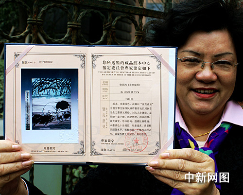 在2009年12月底,這幅畫送權威機構北京中博文物檢測鑒定中心鑒定,經資深文物鑒定專家陳行一先生鑒定,確認為徐悲鴻大師的真跡。陳行一在鑒定意見中還寫道:“劉夫人亦屬豬,是圖繪一家子豬,肥肥胖胖,相依相偎,富貴滿堂。形體結構、透視比例準確,水墨淡色十分到位,形態逼真。背景敷以湖蕩水草,筆觸簡練,不愧為大師之作。畫家作豬十分罕見,彌足珍貴。”