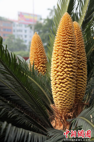 記者在現(xiàn)場(chǎng)看到,小區(qū)院壩內(nèi)共種植的10株鐵樹(shù),都長(zhǎng)得非常茂盛,其中有7株鐵樹(shù)開(kāi)了花,其余的3株也現(xiàn)了花芽;其中1株鐵樹(shù)開(kāi)了3朵雄花,2株鐵樹(shù)都開(kāi)了2朵雄花,2株鐵樹(shù)均是今年開(kāi)的雌花和去年結(jié)的紅色果實(shí)同時(shí)呈現(xiàn),另外還有2株鐵樹(shù)開(kāi)了雌花。