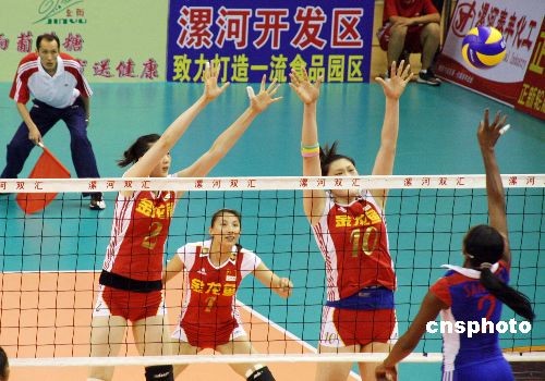 5月31日,2009年中國(guó)國(guó)際女排精英賽(漯河站)在河南省漯河市體育館展開(kāi)最后一場(chǎng)爭(zhēng)奪,由東道主中國(guó)女排對(duì)壘美洲勁旅古巴女排,最終“小諸葛”蔡斌率領(lǐng)的中國(guó)隊(duì)3-0(25-17、25-21、25-15)狂勝對(duì)手,“蔡家軍”以三戰(zhàn)全勝的驕人戰(zhàn)績(jī)奪得首個(gè)冠軍。中新社發(fā) 李慧宇 攝