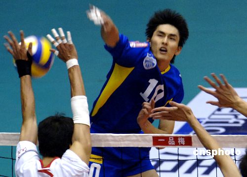 10月20日,在江蘇省淮安市舉行的2007-2008年安踏全國排球聯(lián)賽上,江蘇男排1:3不敵上海男排。中新社發(fā) 曹政 攝