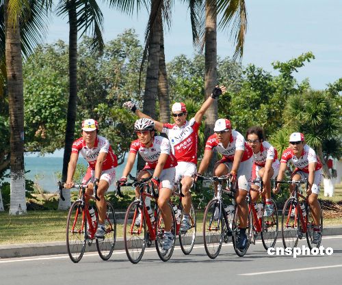 來自二十四個國家和地區的十八支參賽隊伍、一百零六名自行車手已于十一月二日全部抵達海南三亞。上午九時許,各隊選手開始熱身,為明天開始的海馬汽車二00七環海南島國際公路自行車賽做準備。中新社發 彭小云 攝