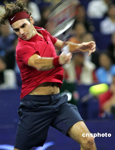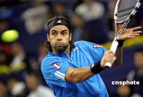 11月12日,“智利火炮”岡薩雷斯在2007上海網(wǎng)球大師杯賽紅組單打比賽中,實(shí)現(xiàn)驚人逆轉(zhuǎn)以2比1戰(zhàn)勝瑞士球王費(fèi)德勒,三盤(pán)比分是3-6、7-6、7-5。中新社發(fā) 湯彥俊 攝
