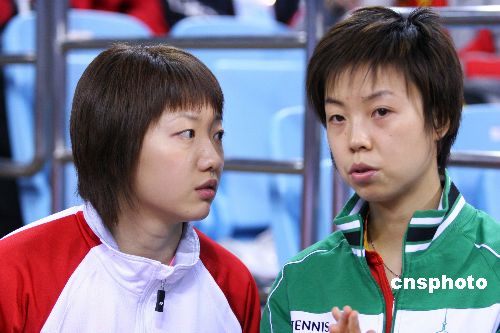 12月15日,“好運北京”大眾汽車2007國際乒聯職業巡回賽總決賽在北京大學體育館繼續進行,在一場女單1/4決賽中,張怡寧以4-0(11-6,11-4,11-5,11-6)擊敗新加坡一姐李佳薇,輕松挺進四強。張怡寧與李佳薇有過多次交戰,加上兩人都曾在北京隊學習訓練,因此都十分了解對手。圖為比賽前兩人在場下交流。中新社發 富田 攝