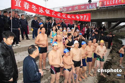 2007年12月31日早晨,江西宜春市冬泳協會在宜春冬泳基地舉行“游進新年,喜迎奧運”暨“2008年全國冬泳日”活動,宜春冬泳協會600多名冬泳隊員參加了活動,數百名冬泳隊員暢游秀江。中新社發 彭小榕 攝
