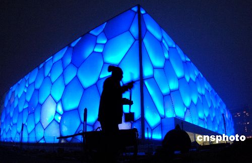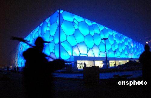 一月十八日,北京奧運游泳館——“水立方”開始調試造型燈光,“水立方”中每個氣泡被照射上藍色燈光,令人暢想奧運水世界。據悉,一月三十一日這里將舉行奧運測試賽,屆時“水立方”將被照射更多的彩色燈光。中新社發 廖攀 攝