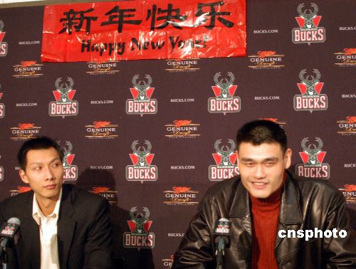 當地時間二月二日,姚明率領休斯敦火箭隊作客密爾沃基布拉德利球館,最終火箭隊以九十一比八十三險勝另一名中國球員易建聯所在的雄鹿隊,獲得三連勝。賽后兩位“中國德比大戰”的主角在雄鹿隊特地安排的聯合記者會上談笑風生,一同向中國球迷致以新春祝福。中新社發 李靜 攝