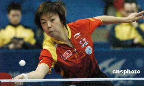 二月二十七日下午,世乒賽女團小組末輪中,中國隊的郭躍、張怡寧和王楠組成強大陣容,以三比零戰勝瑞典隊,憑借A組頭名身份挺進四分之一決賽。中新社發 柯小軍 攝