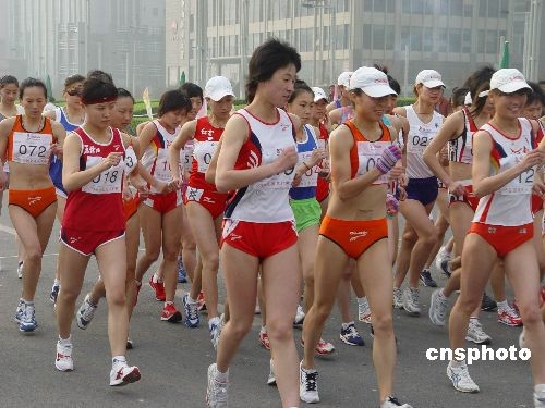 三月十五日,2008年全國競走大獎賽的女子成年組、青年組二十公里競走比賽在鄭東新區的CBD廣場舉行,陜西選手蔣秋艷和陜西選手楊明霞分別獲得女子成年組和青年組二十公里競走比賽冠軍。中新社發 李志全 攝