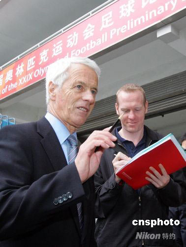 4月22日,國際足聯考察團一行在北京奧組委官員的陪同下抵達上海,對08奧運足球上海賽區籌備工作進行考察。圖為國際足聯競賽部官員瓦特·西伯(左)和約翰·舒馬赫在上海考察奧運足球賽場。中新社發 湯彥俊 攝