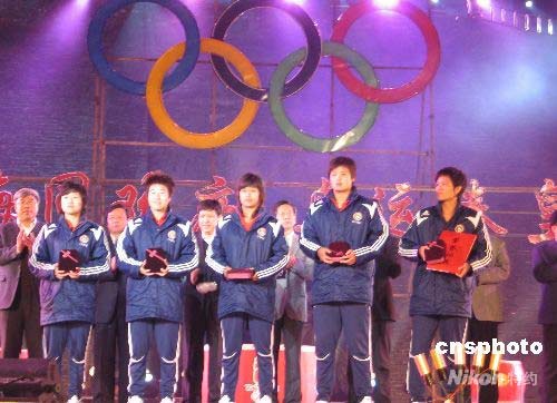 4月29日晚,“山海同歡慶·奧運秦皇島”迎奧運倒計時一百天大型慶祝活動,在“天下第一關”山海關廣場舉行,中國女足被秦皇島市授予榮譽市民。中新社發 潘海濤 攝