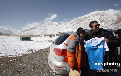 5月4日,由于身體原因,采訪北京奧運火炬接力珠峰傳遞活動的德國記者約克,不得不撤離珠峰大本營新聞中心,退出此次采訪活動返回德國。圖為約克(右)撤離前接受北京奧組委工作人員贈送的簽名襯衫。 中新社發 盛佳鵬 攝