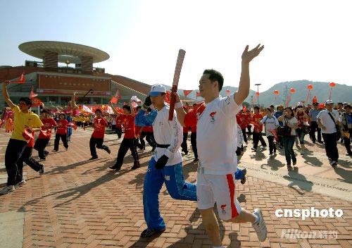 五月十二日上午,奧運圣火在僑鄉泉州中國閩臺緣博物館開始傳遞。圖為第一棒火炬手王家聲跑出中國閩臺緣博物館。 中新社發 王東明 攝