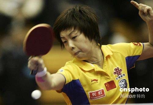 5月17日,在長春舉行的中國乒乓球公開賽女單八分之一決賽中,張怡寧戰勝中國香港姜華珺,殺入四強。中新社發 杜洋 攝