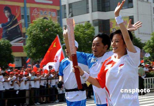 5月29日,奧運圣火在安徽蕪湖傳遞,演員趙薇傳遞首棒火炬。中新社發 廖攀 攝