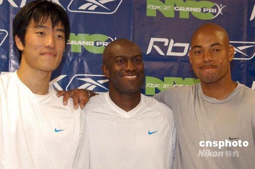 北京時間7月6日消息,在當日進行的美國田徑奧運選拔賽110米欄爭奪中,劉翔最偉大的對手阿蘭-約翰遜小組賽傷勢復發,未能完成比賽,七次世界冠軍沖擊北京奧運的征程提前劃上句號。另一位勁敵,曾跑出12秒90的阿諾德也在1/4決賽搶跑被罰出,將缺席北京奧運。資料圖為劉翔、阿蘭-約翰遜(中)、阿諾德(右)三人的合影。中新社發 劉小青 攝
