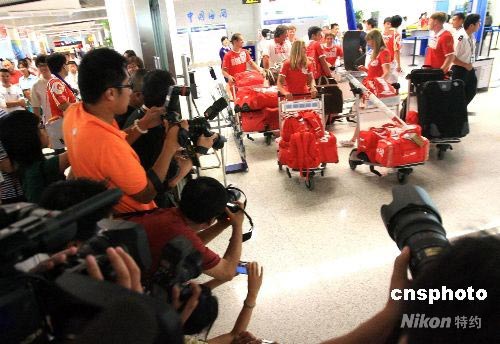7月28日,澳大利亞和俄羅斯隊大隊人馬抵達青島,受到熱烈歡迎,成為媒體焦點。運動員們十分高興,榮幸自己得到明星般的歡迎。 中新社發 羅波 攝
