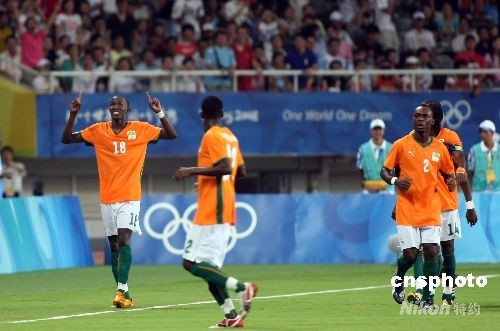 8月7日,北京奧運會上海足球分賽場男足預(yù)賽,作為首次參加奧運會足球比賽的科特迪瓦,在遭遇衛(wèi)冕冠軍阿根廷隊時毫不示弱,球員門以精湛的球技,征服現(xiàn)場球迷贏得掌聲。圖為科特迪瓦18號球員塞古·西塞(CISSE Sekou)進(jìn)球后歡慶。中新社發(fā) 湯彥俊 攝