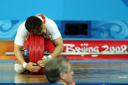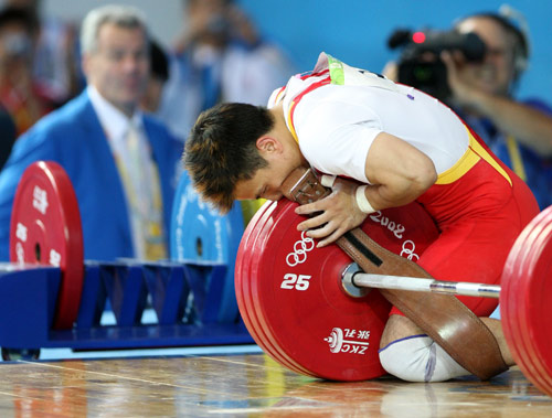 8月11日,中國選手張湘祥獲勝后親吻杠鈴。當日,張湘祥在北京奧運會舉重男子62公斤級決賽中以319公斤的總成績獲得金牌。