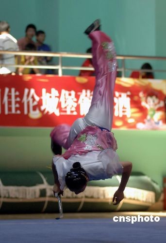 10月28日,武術女子選手進行劍術比賽。第六屆全國農民運動會武術比賽在福建省泉州市體育中心吳家熊國術館進行,武林高手匯集于此,展示高超的國術技藝。中新社發 王東明 攝