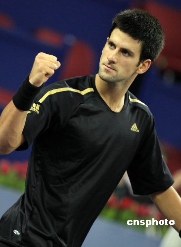 11月11日,在上海旗忠網球中心進行的上海大師杯單打金組第二輪的一場焦點戰中,世界排名第三位的塞爾維亞選手德約科維奇以2比1戰勝俄羅斯“勞模”達維登科。3盤比分是7-6(3)/0-6/7-5。中新社發 湯彥俊 攝