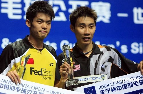 11月23日,在上海舉行的2008年中國羽毛球公開賽男子單打決賽中,中國頭號選手林丹(左)以2比0戰(zhàn)勝馬來西亞選手李宗偉(右),獲得冠軍。這也是他第三次奪得中國羽毛球公開賽的冠軍。中新社發(fā) 湯彥俊 攝
