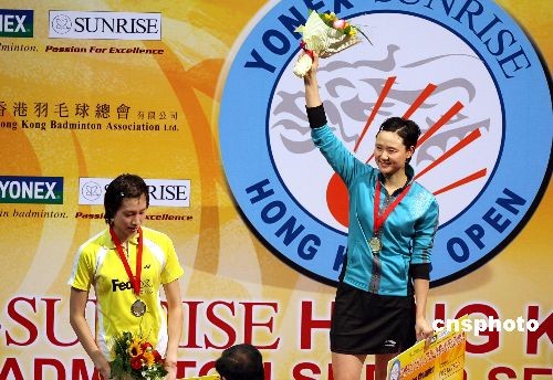 十一月三十日,中國香港選手王晨在香港公開羽毛球超級賽女單決賽中以二比一戰勝中國選手謝杏芳,奪得冠軍。中新社發 武仲林 攝