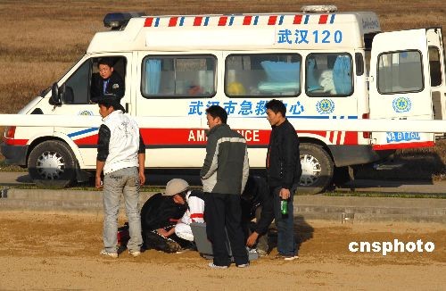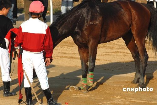 11月30日,在湖北武漢市“東方馬城”舉行的2008年全國速度賽馬錦標(biāo)賽上,2600米沙地?zé)o限定馬決賽第二組在比賽時,發(fā)生賽馬“追尾”驚險一幕。在跑到第二圈進(jìn)入最后全力沖刺時,新疆隊(duì)唐旭駕馭的7號馬“巴黎之眼”避讓不及北京隊(duì)魏云忠駕馭的10號馬“賽速”,兩馬重重地撞在一起,“巴黎之眼”當(dāng)場被撞暈倒地不醒,“賽速”右前蹄則被撞斷受傷嚴(yán)重,所幸兩名運(yùn)動員均無大礙。據(jù)業(yè)內(nèi)人士介紹,賽馬運(yùn)動屬于高風(fēng)險運(yùn)動,運(yùn)動員和馬匹在激烈的比賽過程中,都有出現(xiàn)意外的可能。中新社發(fā) 楚天行 攝