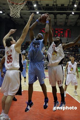 3日,08-09CBA聯賽第八輪的比賽北京金隅客場挑戰山西中宇在山西財經大學體育館打響。北京金隅經過四節苦戰在高命中率的情況下以110:105險勝山西中宇。 中新社發 張云 攝