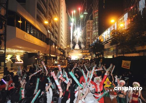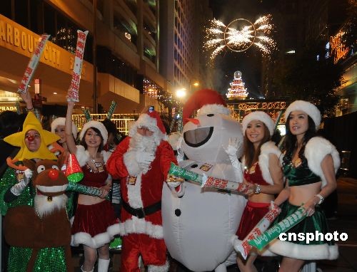 十二月二十四日晚(平安夜),逾十萬(wàn)市民及游客齊聚香港尖沙咀鬧市,參加圣誕倒數(shù)街頭派對(duì),圣誕老人、圣誕女郎及雪人在場(chǎng)助興,節(jié)日氣氛濃厚。中新社發(fā) 蔡蔓莉 攝