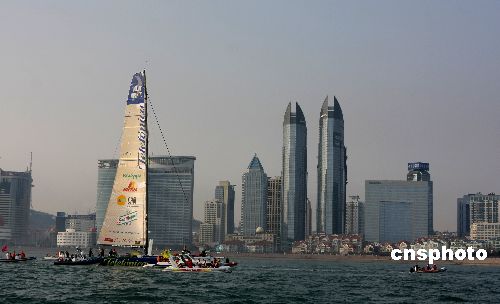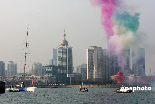 1月29日下午,作為沃爾沃環球帆船賽青島站的冠軍賽船西班牙電訊藍隊率先抵達青島。青島站組委會舉行了盛大的歡迎和頒獎儀式。中新社發 李東升 攝