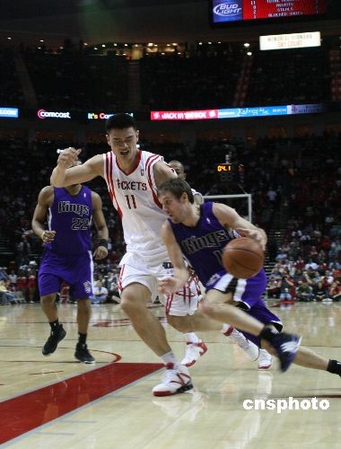 當地時間2月11日,火箭隊在休斯頓豐田中心以94-82擊敗阿帥舊部——聯盟倒數第一的國王,贏得了全明星賽前的最后一場比賽。姚明全場貢獻了24分18個籃板,均為全場最高。中新社發 歐文 攝