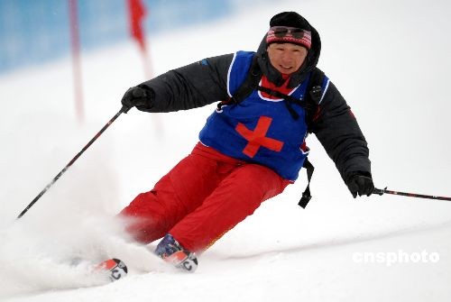 2月24日,在大冬會亞布力滑雪場高山滑雪大回轉比賽中,大冬會醫療救護隊隨時出擊。圖為醫療救護隊馳騁在雪道上。中新社發 姚庭山 攝