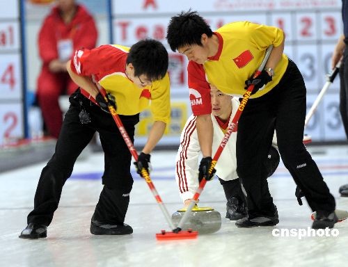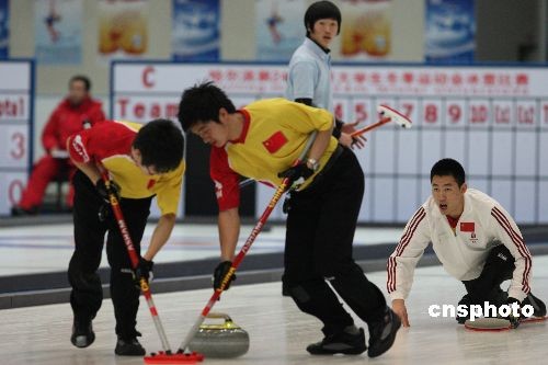 2月26日14時,哈爾濱,大冬會男子冰壺銅牌爭奪戰在黑龍江滑冰館進行,中國隊迎戰韓國隊。經過二個半小時的較量,最終中國隊以9:5戰勝韓國隊,獲得銅牌。中新社發 王忠言 攝