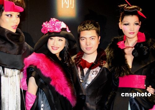 3月28日晚,以“寵愛”為主題的中國國際時裝周SEC2008秋冬高級成衣發布會在北京精彩登場,給觀眾帶來一場震撼的視覺盛宴。圖為演員秦嵐(左二)與設計師祁剛(左三)亮相發布會。中新社發 趙雋 攝