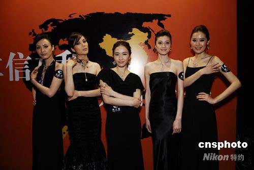 為慶祝中華人民共和國與南非共和國正式建交10周年而舉辦的 “南非風(fēng)情周”大型活動,繼在廣州、香港、北京成功舉行之后,4月底于上海威斯汀酒店再度拉開帷幕。著名珠寶品牌周大福作為活動中唯一的華人珠寶品牌以價值數(shù)千萬的南非珍貴美鉆飾品,為活動的壓軸環(huán)節(jié)“南非時裝秀”增添非凡璀璨光芒。今次在上海更有香港明星黎姿親身演繹, 必令鉆飾更加閃爍動人。圖為眾名模與黎姿合照。中新社發(fā) 楊可佳 攝