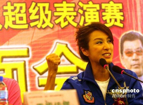 7月5日,香港明星足球隊(duì)代表米雪、成奎安、羅家英和泰迪羅賓在重慶參加“2008中國(guó)·重慶香港明星足球隊(duì)超級(jí)表演賽新聞媒體見(jiàn)面會(huì)”,為表演賽宣傳造勢(shì)。圖為香港明星足球隊(duì)啦啦隊(duì)隊(duì)長(zhǎng)米雪回答記者提問(wèn)。中新社發(fā) 郭晉嘉 攝