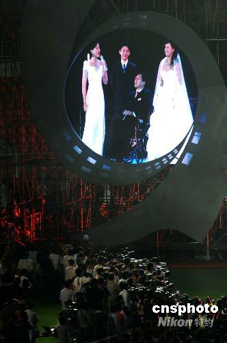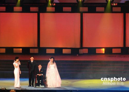 9月10日晚,在遼寧大連市舉行的第17屆金雞百花電影節開幕式上,高位截癱的大連志愿者、2008年殘奧會火炬手韓偉與女友陶璐舉行現場婚禮,并講述兩人因為電影而結緣的故事。在觀眾的見證下,兩人現場許下愛的誓言,交換婚戒。他們的愛情故事感動了現場的觀眾。影星鄧超為他們送上了自己的祝福。中新社發 劉德斌 攝