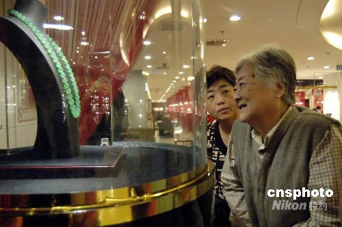“十一黃金周”臨近,一款估價為1.2億元的天價翡翠項鏈亮相某珠寶商城,為節日市場先期預熱,由57顆顏色濃綠、質地細膩的“老坑玻璃種”翡翠珠子串成的翡翠項鏈,懸賞總價值10萬元的翡翠飾品作為獎品向全球征名,以期弘揚中華傳統玉文化。中新社發 徐曦弋 攝