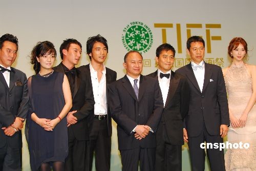 10月18日傍晚,第21屆東京國(guó)際電影節(jié)開幕。以“環(huán)保”為主題的本屆電影節(jié)別出心裁地將星光大道的地毯由紅色改為綠色。上個(gè)月剛剛當(dāng)選日本首相的麻生太郎與開幕影片《赤壁》劇組成員同走綠地毯,成為第一個(gè)光臨東京國(guó)際電影節(jié)現(xiàn)場(chǎng)的日本總理大臣。圖為《赤壁》主創(chuàng)人員在電影節(jié)開幕式上亮相。中新社發(fā) 侯宇 攝