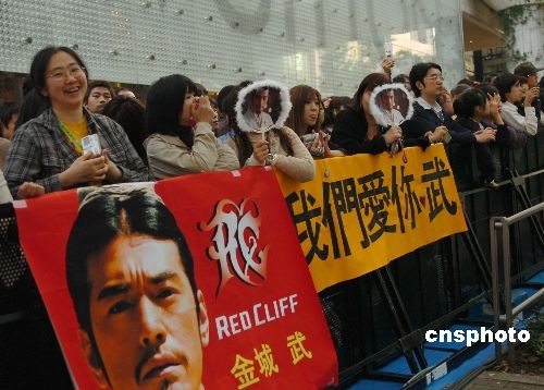10月18日傍晚,第21屆東京國際電影節在東京六本木新城開幕。中國兩岸三地影人攜手打造的巨片《赤壁》作為揭幕影片,成為開幕式上的最大亮點。圖為金城武影迷早早趕到現場,在星光大道兩側等待偶像。中新社發 朱沿華 攝