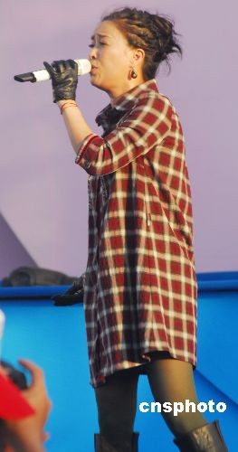 2008年11月16日,那英在第九屆中國海南島歡樂節開幕式上獻歌《征服》、《我只喜歡你》,用熟悉的旋律征服了眾多歌迷,掀起一陣快樂旋風,并引發現場觀眾大合唱。那英一身紅格子長衣至大腿,以高筒靴、黑手套、網狀絲襪,盡現個性與神秘魅力。她說在歡樂節上有自己的許多第一次——第一次到文昌,第一次參加海南歡樂節,第一次在歡樂節上獻歌,更是第一次在下午站在海邊舞臺上演唱。中新社發 善平 攝