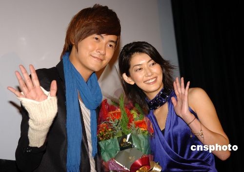 11月18日,臺灣人氣小生鄭元暢在東京助陣日本版《惡作劇之吻》的DVD發賣,并首次與日版“相原琴子”的扮演者佐藤蘭子碰面。二人本別披露各自的拍攝內幕,令現場近二百名粉絲大笑不已。圖為鄭元暢與佐藤蘭子在活動現場向合影。中新社發 朱沿華 攝