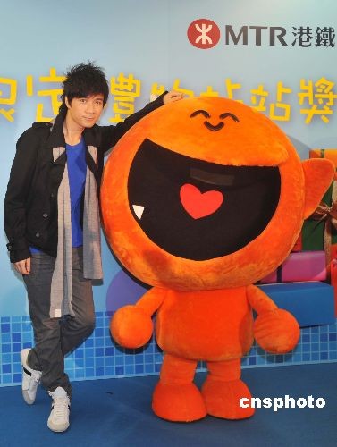 十一月二十四日,香港歌星古巨基帶著其設計的“愛兒” Kubi,出席港鐵友禮會“站站獎”宣傳活動。中新社發 鄧慶樂 攝