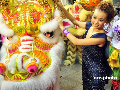 二月二日年初八,香港著名歌星容祖兒擔任時代廣場“金龍醒獅賀新歲”嘉賓,為六頭醒獅點睛及參花掛紅。中新社發 譚達明 攝