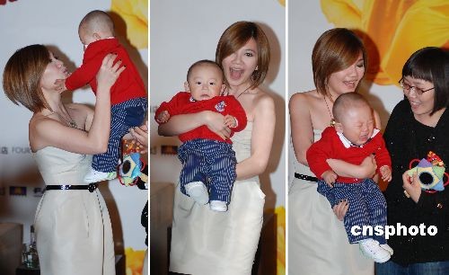 4月20日,馬來西亞“情歌天后”梁靜茹亮相北京,出席將于5月27號(hào)舉辦的“2009梁靜茹今天情人節(jié)北京演唱會(huì)”發(fā)布會(huì)。 在梁靜茹2005年北京演唱會(huì)上,有一位男孩在梁靜茹的鼓勵(lì)下向愛人求婚,終成連理。前不久,他們的寶寶出世。發(fā)布會(huì)當(dāng)日,一家三口特別來到現(xiàn)場(chǎng)為梁靜茹加油。而他們的寶寶也成為梁靜茹年齡最小的“粉絲”。圖為梁靜茹抱起小“粉絲”,十分開心。中新社發(fā) 李學(xué)仕 攝