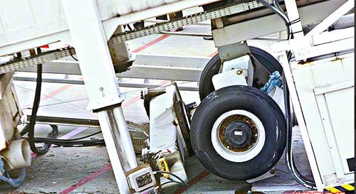 桃園國際機(jī)場航空站副主任張鐵源表示,經(jīng)查是空橋支柱與輪子間銜接處斷裂,初步排除是維修保養(yǎng)不足釀禍,今將請空橋韓國原廠代理商到現(xiàn)場檢測,調(diào)查真正原因。