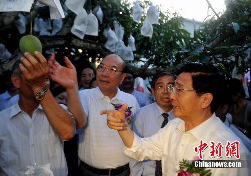 郭聲琨一行的到來受到當地民眾的熱烈歡迎。果農以一種特別的方式——燃放爆竹來歡迎遠方的客人。郭聲琨抵達臺南縣南化鄉小侖村時已值傍晚,他深入果園,參觀豐收在望的芒果園,與果農親切交流,了解水果產銷情況,并走進集貨場,參觀貨場水果分揀,包裝作業過程,品嘗臺南水果。
