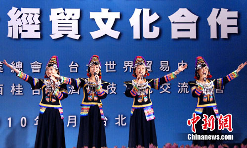 中新網臺北7月4日電(廖祖平)中共廣西壯族自治區委員會書記郭聲琨率領1000余人的廣西經貿文化代表團7月1日—7月5日在臺灣參訪,這是海峽兩岸經濟合作框架協議(ECFA)簽署后大陸第一個赴臺的經貿文化代表團。客家人聚居的廣西賀州市也由市委書記彭曉春率賀州代表團隨廣西團一起赴臺。7月3日下午,由桂臺(賀州)客家文化旅游合作示范區與臺灣世界客屬總會、廣西同鄉會聯合主辦的桂臺(賀州)客家文化旅游經貿合作懇談會在臺北舉行。